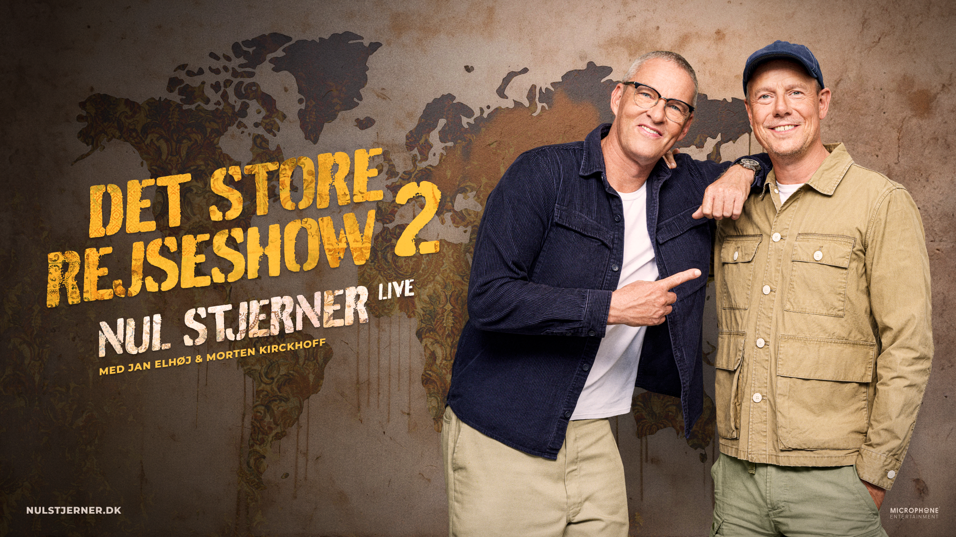 Det succesfulde program fra DR med Jan Elhøj og Morten Kirckhoff vender tilbage til de skråbrædder med en helt ny live-tour: "Nul Stjerner - Det Store Rejseshow 2".