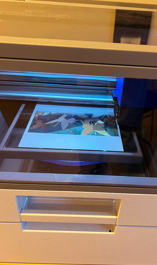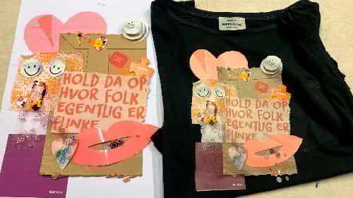 Når jeres collage er færdige, overfører vi dem til tekstil – enten en mulepose eller en t-shirt - ved hjælp af vores tekstilprinter. I får mulighed for at prøve processen og se, hvordan ens motiv bliver til et tryk.