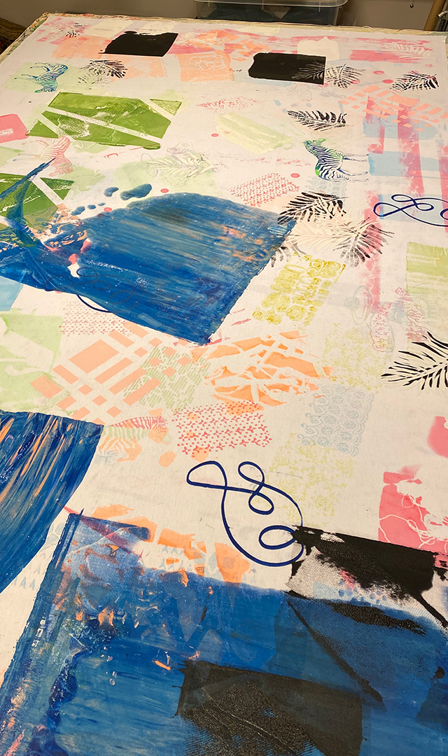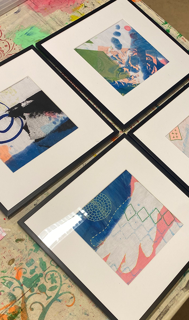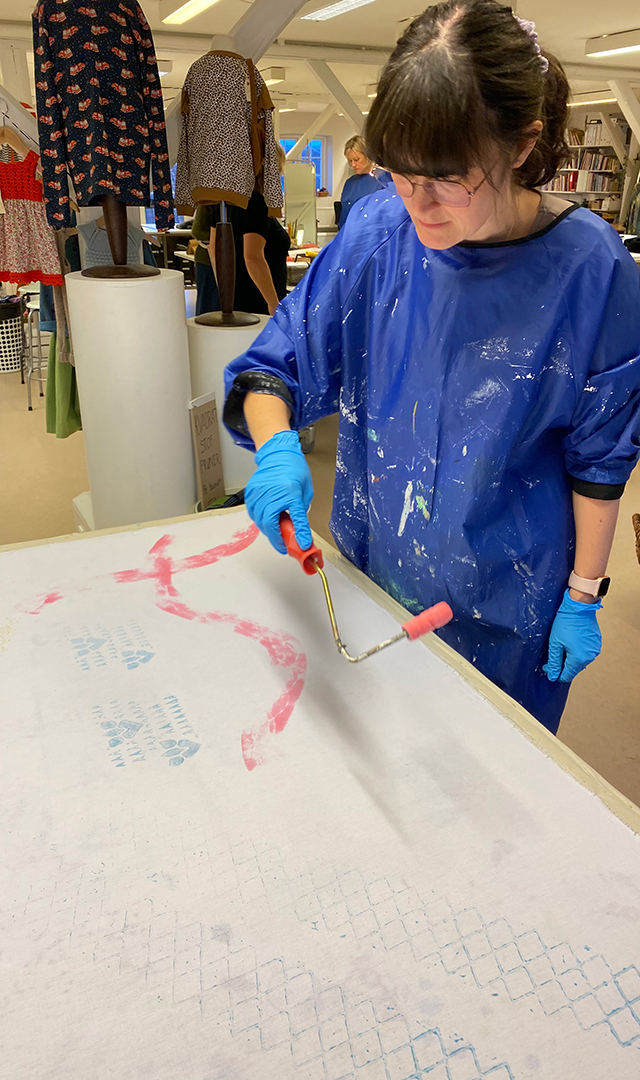 I fællesskab laver I det store værk med trykteknikker og stencils på lærred. Vi bruger materialer til at gøre udtrykket tredimensionelt, og til sidst udvælger vi dele af værket, der kommer i rammer – lige til at tage med hjem og hænge på væggen. Kunst skabt i fællesskab.