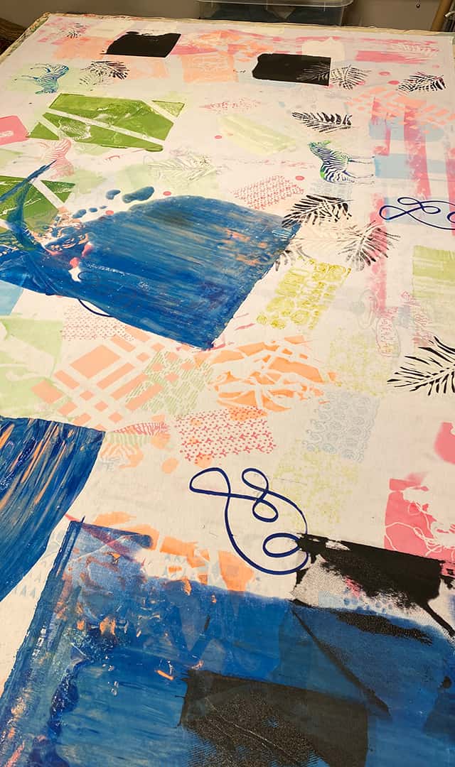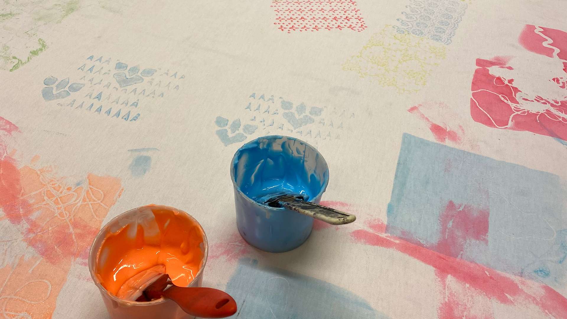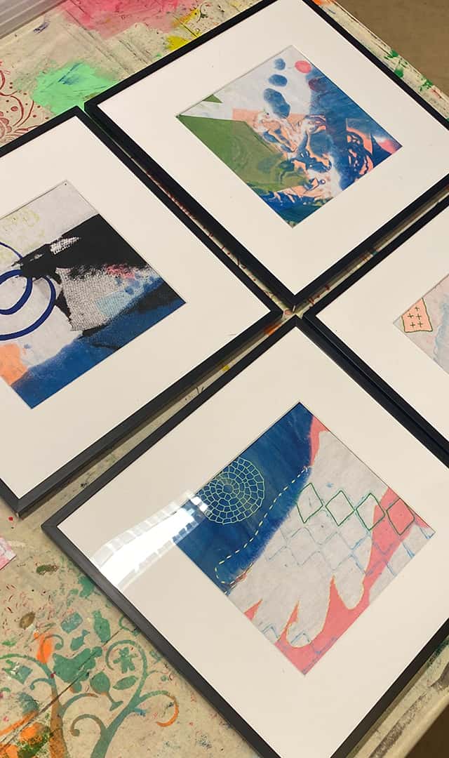 I fællesskab laver I det store værk med trykteknikker og stencils på lærred. Vi bruger materialer til at gøre udtrykket tredimensionelt, og til sidst udvælger vi dele af værket, der kommer i rammer – lige til at tage med hjem. Kunst skabt i fællessskab.